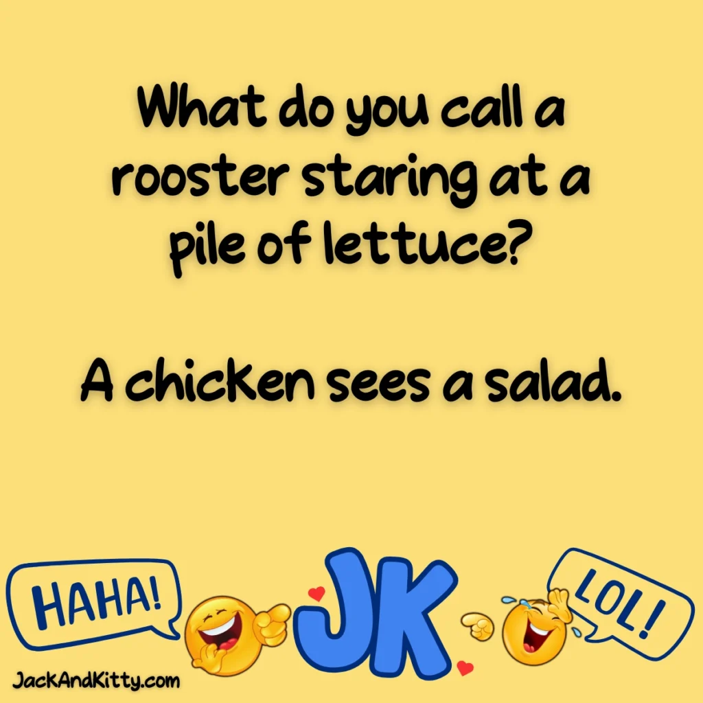 What do you call a rooster staring at a pile of lettuce? A chicken sees a salad.